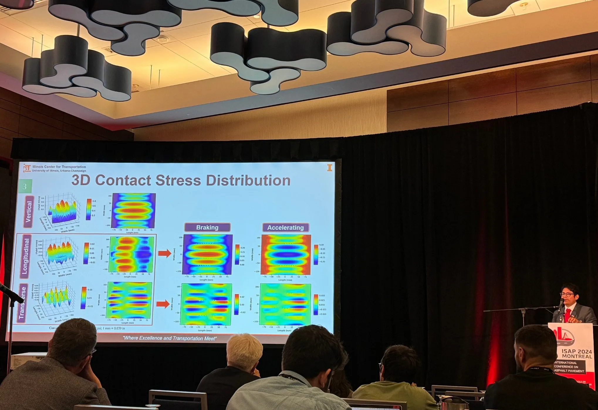 Seeing my slide projected at full scale, with the contact stress distribution patterns side by side (see Figure 3), I remember focusing on explaining how the dynamic loading effects were incorporated into the model, and how they influenced the pavement responses. I also highlighted the practical implications of our findings for pavement design and maintenance, especially in the context of increasing traffic loads from emerging vehicle technologies. Looking out at the audience, I could see nods of understanding and interest, which is always rewarding as a presenter. After the presentation, I engaged in discussions with several attendees who had questions about our methodology and results. I think this presentation was an inflection point in my delivery. Generally, I tend to speak quickly when I'm nervous, but this time I consciously slowed down, focusing on clarity and engagement. It felt like a more polished performance, and I received positive feedback from Prof. Al-Qadi afterwards. As usual, my ICT colleagues were there to support me during the presentation. This is how we all manage to capture these moments. One should only focus on looking good for the camera!