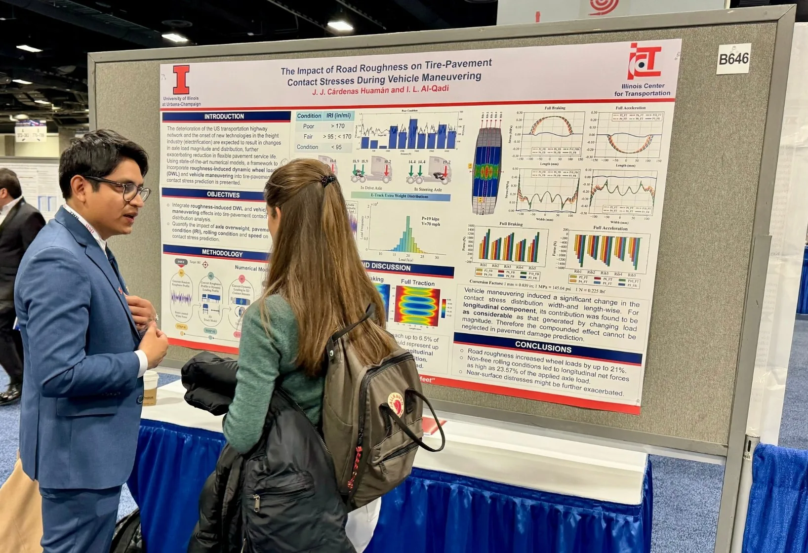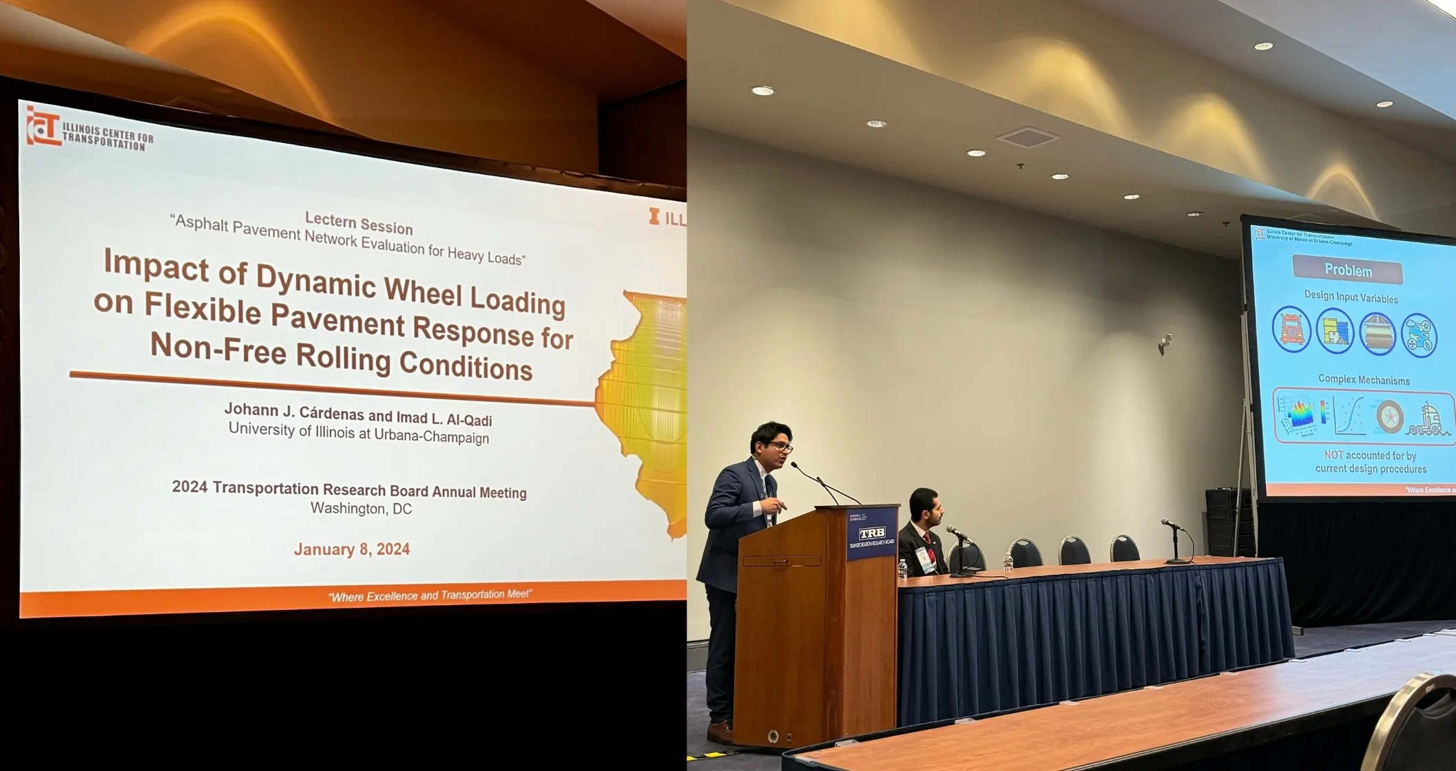 On Monday, January 8th, at 8:00 AM, I presented my first lecture session titled "Impact of Dynamic Wheel Loading on Flexible Pavement Responses for Non-Free Rolling Conditions" as part of the Asphalt Pavement Network Evaluation for Heavy Loads session. The technical heart of this presentation is rather simple: pavements experience time-varying forces influenced by suspension dynamics, tire characteristics, speed, and the rollin condition (particularly when motion is not purely steady-state free rolling). That same morning, and right after my presentation, Jaime Hernandez presented "Effect of Heavy-Duty Electric Vehicles on Pavement Contact Forces", which focused on our early findings from the R27-252 project. Here, we explored how different electric semitruck configurations impact pavement contact forces compared to traditional diesel trucks, particularly under greater torque demands during acceleration.