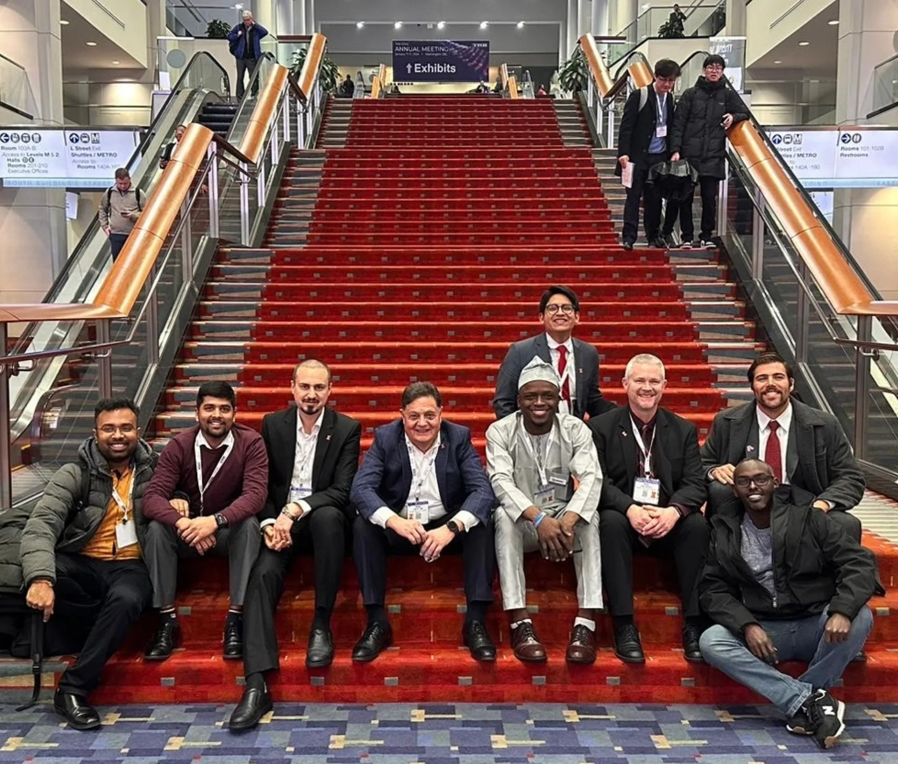 This picture (Figure 4) was taken at the last day of the conference. We gathered on that iconic red staircase, suites on, ready to head back home after a busy week of presentations, networking, and learning. I believe is one of the most informal pictures we have ever taken of Prof. Al-Qadi with his students. From left to right: Aravind Ramakrishnan,. Aditya Singh, Mohsen Motlag, Imad Al-Qadi, Abdulgafar Sulaiman, me (Johann Cardenas), Greg Renshaw, Javier Garcia-Mainieri and Uthman Mohammed Ali. It was a spontaneous, fun, and a great way to end the trip. As a first-time presenter at TRB, I was grateful for the opportunity to share our work and contribute to the ongoing research at ICT, and knew that upcoming experiences would only be better. I think this was the year, that I finalize my reception crawl agenda, one that I've been following by the book ever sice. After three years, it is easier to know where to head, when to go, and who to meet. Looking forward to TRB 2025!
