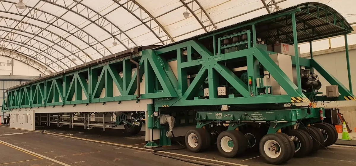 The 5340 kN Testing Machine spans two sets of railway tracks that are 23.2m apart. The vehicle has adjustable dual-wheel loading modules.