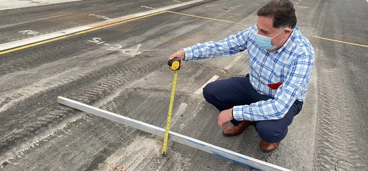 For rutting evaluation, a straightedge was placed across the wheel path and the rut depth was measured manually with a tape. That measurement is a snapshot of permanent deformation. It's also a nice reality check for a numerical model. Because rutting is not just the result of one mechanism, we could be looking at shear flow in asphalt layers, mix instability, or even contributions from underlying layers depending on the structure and temperature. Prof. Al-Qadi could not resist the temptation to measure the rut depth himself (see Figure 6).